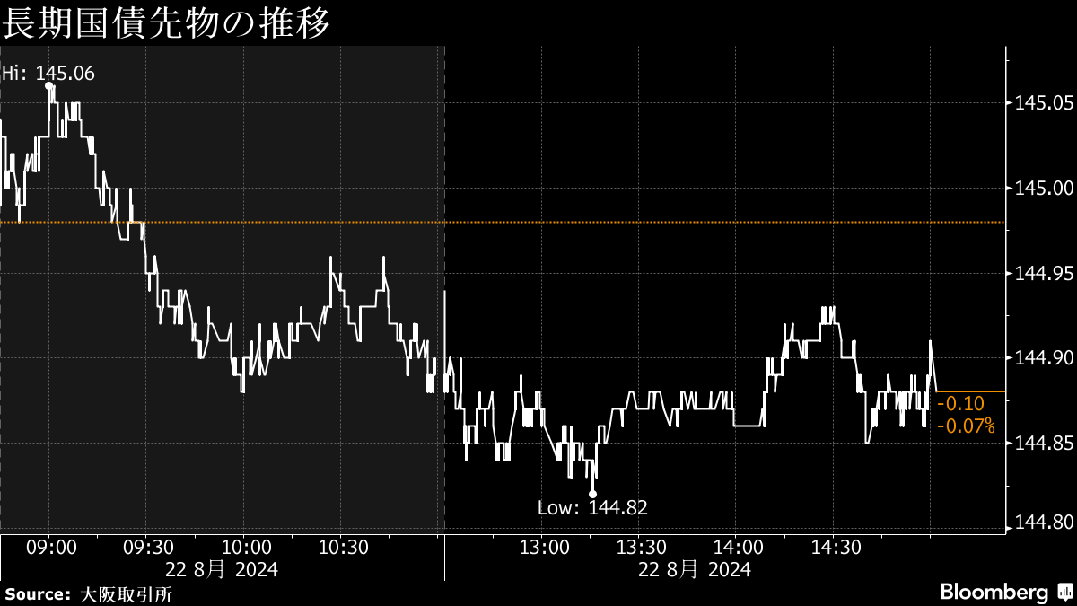 債券相場は中長期債と先物が下落。植田日銀総裁の閉会中審査を控えて投資家の姿勢が慎重で、売りが優勢だ。流動性供給入札がやや弱めの結果になったことも相場の重しになった。一方、利下げ観測の高まりを受けて米金利が低下する中、超長期債は買われた。