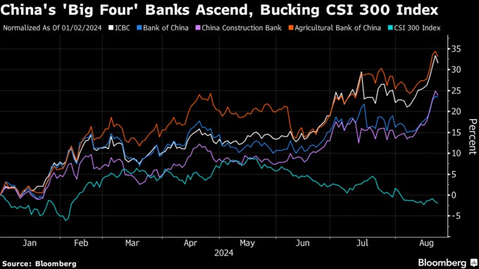 (ブルームバーグ):中国経済が苦境で、不動産危機が深刻化する中で、株式投資家が敬遠するとすれば銀行株だろう。しかし、投資家は高配当と政府支援を期待し、銀行株は勝ち組となっている。