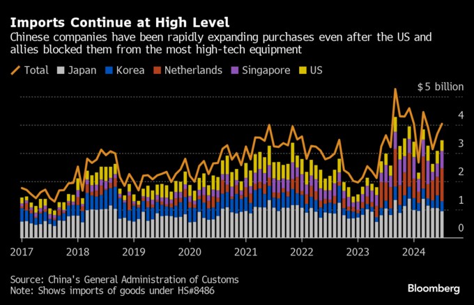 (ブルームバーグ):中国による半導体製造装置の輸入が今年1-7月に過去最高に達した。米国およびその同盟国が中国企業による入手をさらに阻止する場合に備えた動きで、購入の増加が続いた。