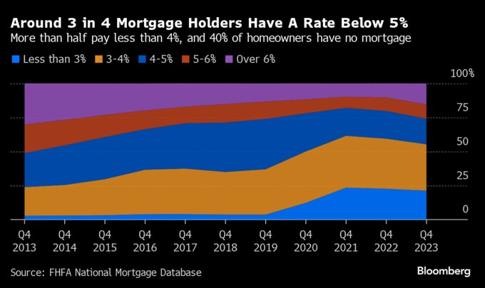 スイス・リーによると最近の金融引き締めサイクル中、米住宅ローンの市場金利は借り手が既存のローンで支払う平均金利を3.2ポイントも上回った。