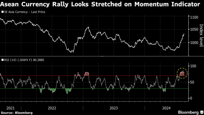 ブルームバーグの集計データによると、東南アジア通貨の相対力指数(RSI)は80を突破し、一般的に買われ過ぎと見なされる水準を大きく上回った。9月に米利下げが実施されるとの観測が広がる中、東南アジア通貨は今月に入り地域別パフォーマンス番付で上位4位を占めていた。
