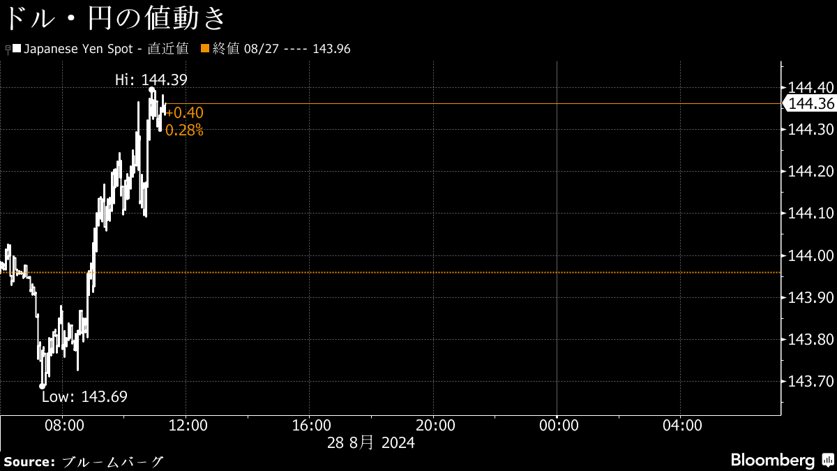 (ブルームバーグ):28日の東京外国為替市場の円相場は1ドル=144円台前半に下落。金融機関が外為取引の基準レートとする公示仲値の設定にかけて実需のドル買い・円売りの動きが出たほか、日本銀行の氷見野良三副総裁の発言もドル買い要因となっている。