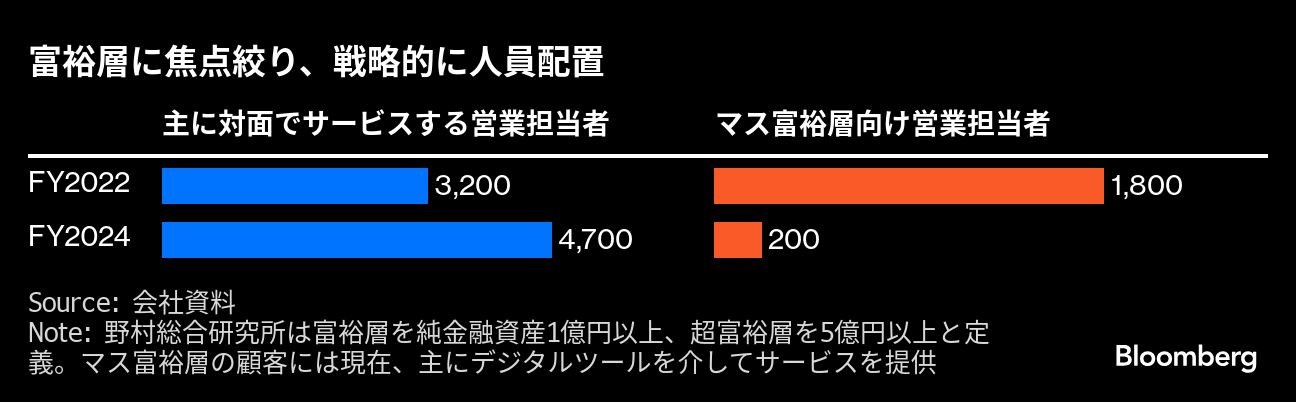 野村HDは永井浩二社長(当時、現会長)の下で2019年に営業部門の見直しを進め、自然減や採用抑制で全体の営業担当者を減らす一方、富裕層や法人など担当領域を明確化。23年には大規模な配置転換により富裕層向け強化を鮮明にした。部門全体の人員は19年から2割強減って足元で約7300人となった。