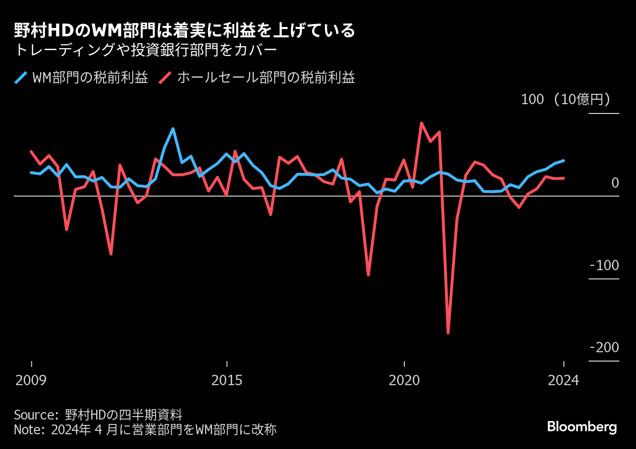 野村HDは金融市場に左右されにくい収益構造を目指し、富裕層向け事業を強化している。米国のモルガン・スタンレーやスイスのUBSグループなどが先行例となる。野村HDにとっては今後のWM部門の成長が他部門の収益の振れをカバーする意味でも鍵となる。