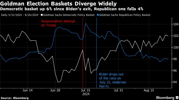 こうした変化は市場の動きにも表れている。両党の政策などに絡んだ取引戦略を追跡するゴールドマン・サックス・グループの指数では、バイデン氏の選挙戦撤退直後から、民主党バスケットが共和党バスケットを上回るパフォーマンスを見せている。
