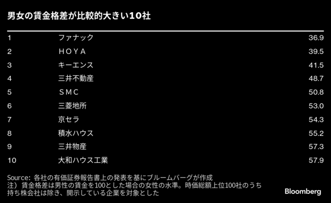 8月15日時点での時価総額上位100社のうち、持ち株会社を除き2期分を開示している70社を対象にブルームバーグが調べたところ、男性の賃金を100とした場合の男女賃金格差が5ポイント以上改善した企業は1社のみだった。