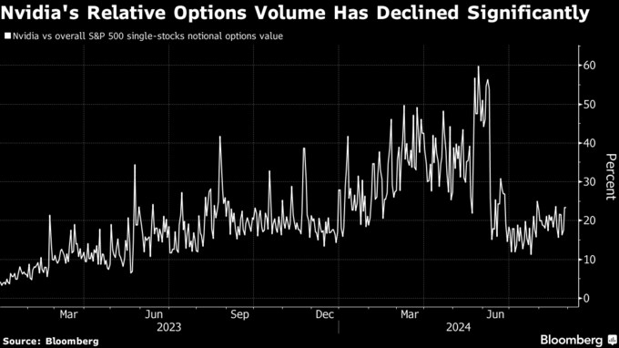 考えられる説明としては、エヌビディアのデリバティブ取引が最近になって比較的静かだったために、株式市場全体の下落につながるヘッジフローが減っていた可能性が挙げられる。ブルームバーグの計算によると、S&P500種単一銘柄オプションの想定元本全体に占めるエヌビディアの比率は、5月と6月に50%以上だったが、今では大きく下がって20%強となっている。