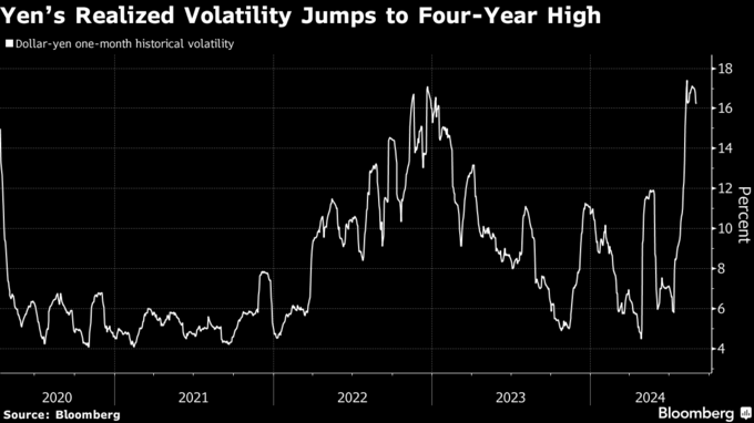円相場のヒストリカルボラティリティー(1カ月)は、4年ぶりの高水準に達した。7月末の金融政策決定会合で追加利上げを決めた日銀の植田和男総裁は会見で、経済・物価の情勢が見通しに沿って動けば、今後も利上げを継続するタカ派姿勢を強調。相場の大混乱を受け、内田真一副総裁は市場が不安定な状況で利上げはしないとハト派色を見せたが、植田総裁は国会閉会中審査での答弁で基本姿勢を維持した。