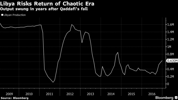 (ブルームバーグ):政治危機により、リビアの石油生産が、独裁者カダフィ元大佐の失脚後に長年続いた混乱に逆戻りする恐れがある。
