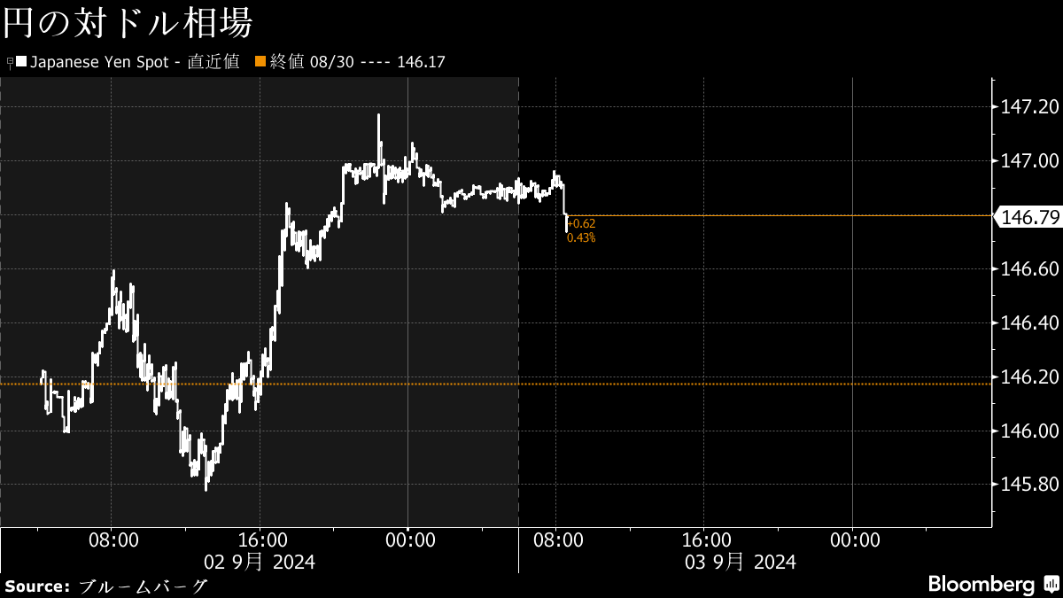 (ブルームバーグ):3日の東京外国為替市場の円相場は1ドル=146円台後半と2週間ぶり安値圏で推移している。米国の株式・債券市場が「レーバーデー」の祝日で休場だった中、欧州市場でポジション調整により円が売られた。週末に米雇用統計を控え、米大幅利下げ観測の沈静化により円は弱含みで推移しそうだ。