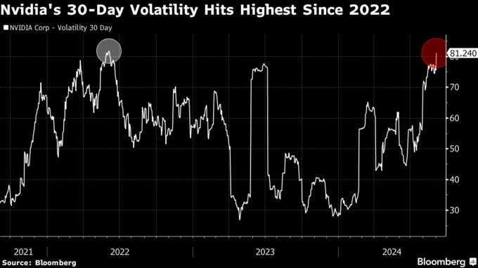 3日の急落により、エヌビディアの株価が1日で6%を超える変動となったのは過去2カ月で7回目となった。ブルームバーグがまとめたデータによると、エヌビディア株の30日ボラティリティーは2022年半ば以来の高水準となっている。