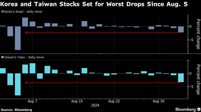 原題:Taiwan’s Taiex Drops Most in a Month Amid Global Chip Stock Rout、Chipmakers Drag Asian Stocks Lower on Renewed AI Valuation Worry(抜粋)