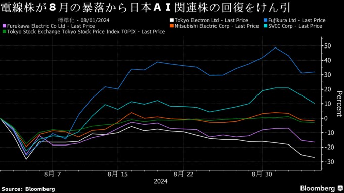 年初の日本株上昇をけん引した半導体銘柄は、米エヌビディア株の急落が世界のハイテク株売りをもたらした後も相対的に割高なままだ。そのため投資家は、電線や電力、バッテリー関連など、AIインフラの構築に必要な企業に広く目を向けるようになっている。