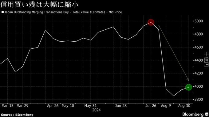 さらに、8月の下げを増幅させた主犯格とみられるのが、大量にたまっていた信用買い残の投げ売りだ。急落直前の買い残は18年ぶりの高水準に膨らんでいた。一方、T&Dアセットマネジメントの酒井祐輔シニア・トレーダーは、こうしたポジションは先月の暴落で「既にふるい落とされており、パニック的なことは起こらないだろう」との見方を示す。