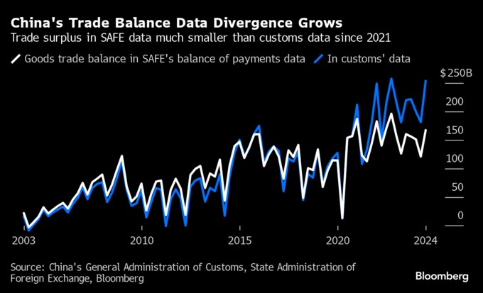 国際通貨基金(IMF)によれば、SAFEは中国企業と外国企業との間の取引を対象としているのに対し、税関の統計は物品の越境移動に基づいている。