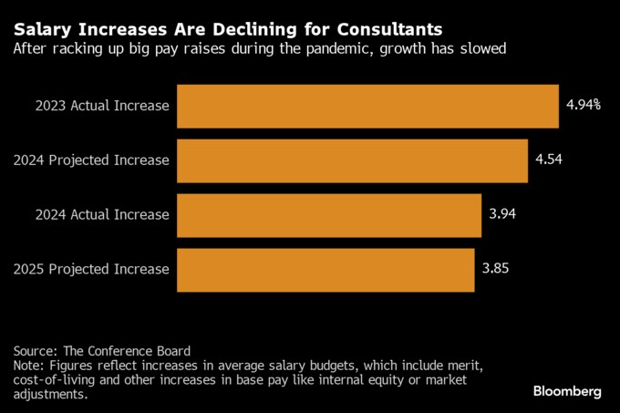 米民間調査機関のコンファレンスボードによると、コンサル業界の昇給率は3年連続で鈍化すると予測されている。コンサル企業の報酬管理責任者を対象とする調査で、同業界の平均給与予算は来年、わずか3.85%の増加にとどまる見通し。伸びは今年からやや縮小し、5%近かった2023年を1ポイント余り下回るとみられている。