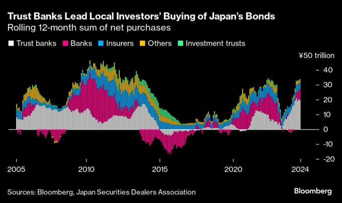 過去12カ月間で国債の最大の買い手は年金の代理と見なされる信託銀行だった。年金積立金管理運用独立行政法人(GPIF)は昨年度、国債の保有額を25%増やした。
