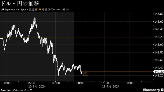 (ブルームバーグ):11日の東京外国為替市場の円相場は1ドル=142円台前半で堅調に推移。米国市場では原油安を背景に長期金利が一段と低下し、円買い・ドル売りが優勢となった。目先は米大統領選候補者討論会を注視しつつ、日本時間夜に発表される8月の米消費者物価指数(CPI)を見極める展開だ。