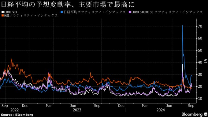 (ブルームバーグ):8月の日本版「ブラックマンデー」以降、日本株の予想変動率が世界の株式市場の中で最も高水準で推移している。投資家が相場の二番底形成を強く警戒している証左だが、一方で再度の急落に対する備えができているとも言え、こうした警戒は杞憂(きゆう)に終わる可能性がある。