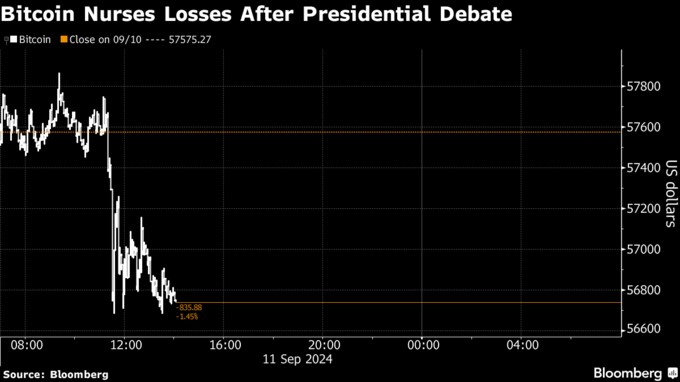 (ブルームバーグ):暗号資産(仮想通貨)ビットコインはアジア時間11日の取引で下落した。米大統領選の民主党候補ハリス副大統領と、同業界を支持している共和党候補トランプ前大統領が対決した米大統領選討論会にトレーダーが反応した。