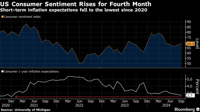 (ブルームバーグ):9月の米ミシガン大学消費者マインド指数(速報値)は上昇し、4カ月ぶり高水準となった。1年先のインフレ期待が2020年12月以来の水準に低下したことなどが寄与した。