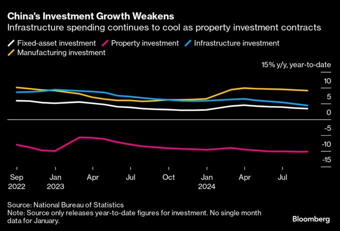 国家統計局のデータによると、地方政府の資金調達不調などが響き1-8月期の固定資産投資は前年同期比3.4%増と、1-7月期の3.6%増から鈍化した。不動産投資は引き続き縮小しており、1-8月期は10.2%減となった。