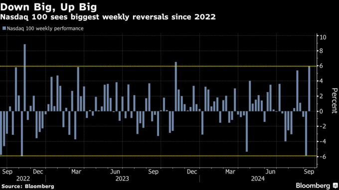 今週の米連邦公開市場委員会(FOMC)で0.5ポイントという大幅利下げが決まるのではないかという期待感の高まりを受け、運用担当者は自信を強めた。13日終了週の金融市場ではハイテク株や暗号資産(仮想通貨)、ジャンク(投機的格付け)債が再び活気づいた。