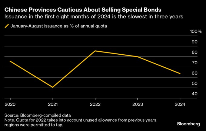 中国の地方はかつて成長のけん引役を果たしたが、今では支出に及び腰だ。今年1-8月の新規の地方特別債の発行は2021年以来の鈍いペースで、ブルームバーグがまとめたデータによると、今年はまだ地方合計で約1兆4000億元(約28兆円)の発行枠が残っている。