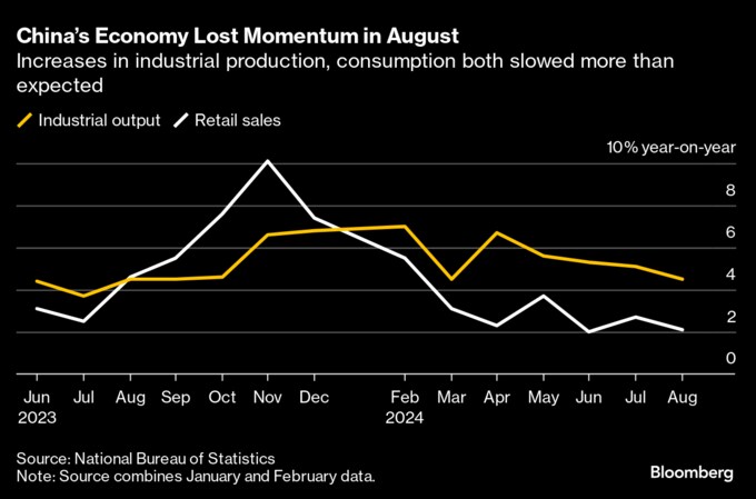 中国の4-6月国内総生産(GDP)は前年同期比4.7%増に減速したが、8月のデータはそれ以降も景気軟化が続いていることを裏付けた。同四半期の成長率は5四半期ぶりの低さで、中国政府が通年の目標とする5%前後にも及ばなかった。