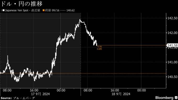 (ブルームバーグ):18日の東京外国為替市場で円相場は1ドル=141円台半ばに上昇。同日の米連邦公開市場委員会(FOMC)での大幅利下げ観測が強く、結果発表を前に円買い・ドル売りが優勢になっている。金融機関が外為取引の基準レートとする公示仲値の設定にかけて実需の円買いも指摘された。