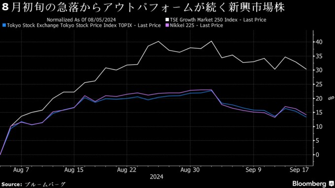 東証グロース市場250指数(旧マザーズ指数)は、日本株相場が8月初めに1987年以来最悪の下落率を記録してから30%以上上昇した。反発率は、円高で業績へのマイナス効果が警戒されやすい時価総額上位の自動車や電機株などを含む東証株価指数(TOPIX)の15%に対し2倍を超す。