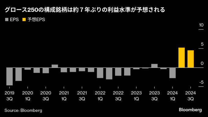 アナリストらも、日本の新興企業のファンダメンタルズに対し楽観的だ。グロース250銘柄の1株当たり利益予想(EPS、加重平均)は5.2円と2017年6月以来、およそ7年ぶりの高水準に達する見通し。一方、日経平均株価銘柄のEPSは7-9月期に2四半期ぶりの水準が予想されている。