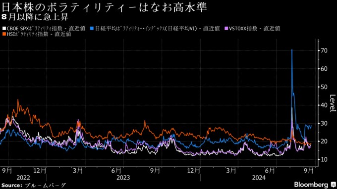 米連邦準備制度理事会(FRB)は18日に0.5%の大幅利下げに踏み切る一方、パウエル議長は今後の利下げを急がない姿勢を示した。これを受けて海外市場でドル・円相場は乱高下。8月初めに急落した日本の株式相場は回復傾向にあるが、ボラティリティー(変動率)が高止まりしている。