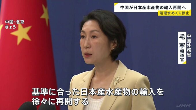 福島第一原発の処理水放出を受け、中国が輸入を停止している日本産水産物について、中国政府は「基準に合った水産物の輸入を徐々に再開する」と発表しました。中国外務省 毛寧報道官「中国側の要求が十分満たされ…