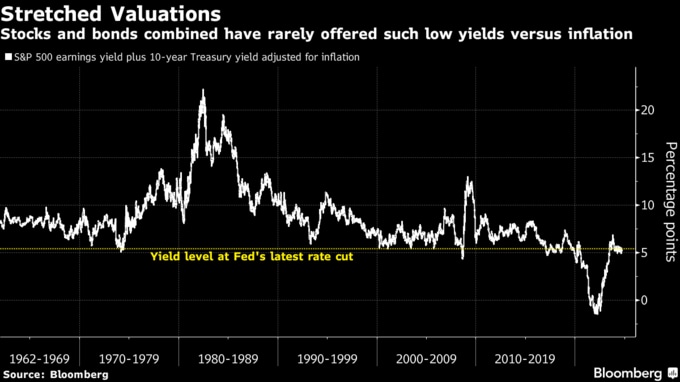 相場の上振れを妨げる要因がバリュエーションだけになって久しいが、現状では、投資家の大きな賭けを狂わせる状況が起きた場合に失敗の余地はほとんどない。S&P500種株価指数利回りと米10年国債利回りについてインフレを調整したモデルによると、足元の価格は過去14回全ての米金融緩和サイクル開始時よりも高い水準にある。