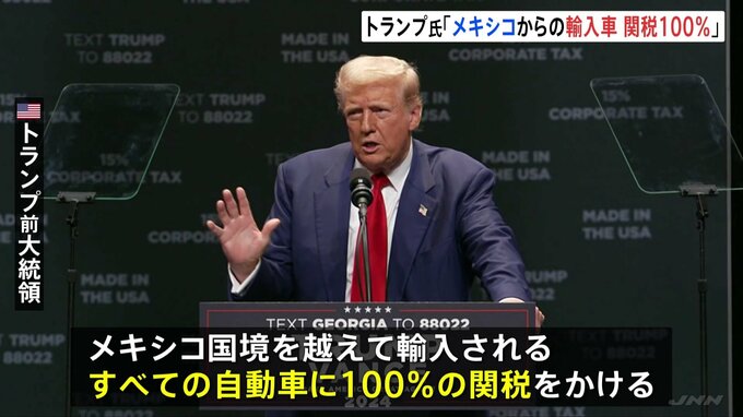 アメリカのトランプ前大統領が「大統領選で勝利すれば、メキシコから輸入するすべての自動車に100%の関税を課す」考えを表明しました。アメリカ トランプ前大統領「メキシコ国境を越えて輸入されるすべての自動…