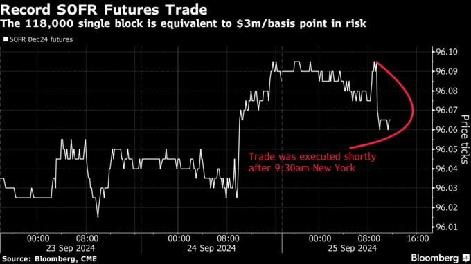 CMEグループは、今回のブロックがこの商品として過去最大規模であることを確認した。4月には、今回と同じSOFR先物2024年12月限で7万5000枚の大口取引が買い手主導で行われたが、これを上回った。
