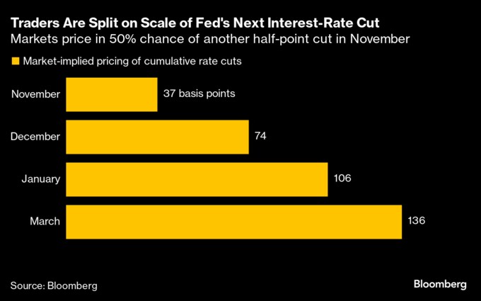 トレーダーらは11月末までに約37bp相当の緩和、2024年末までに合計約75bpの利下げを織り込んでいる。これは、次回FOMC会合で再度の0.5ポイント利下げが実施される確率を50%とみていることを示唆する。