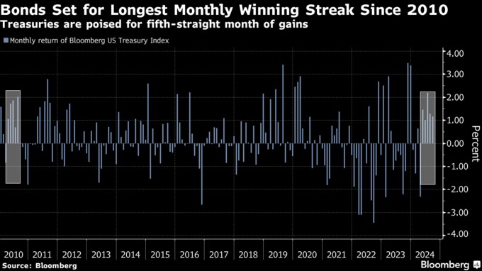 原題:Treasuries Head for Longest Run of Monthly Gains Since 2010(抜粋)