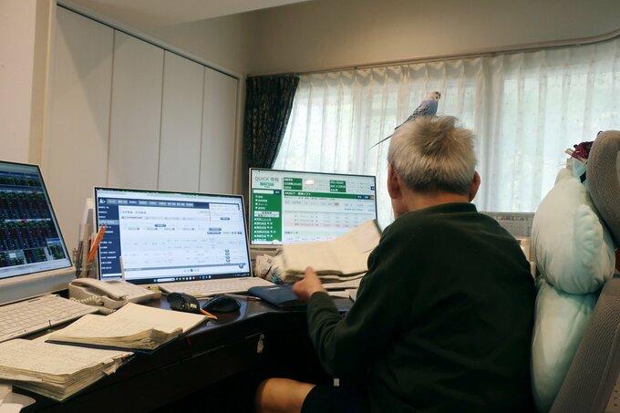 「株をやって規則正しい生活をすると、ボケんといつまでも楽しく生活できる」。兵庫県神戸市の自宅で、トレードをしやすいよう60万円ほどをかけたオーダーメードの机に向かい、当日取引をする銘柄の目星を付けながら売り買いの注文を出す。