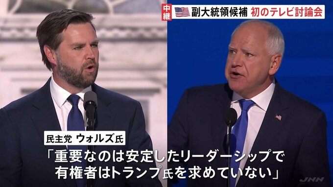 来月にせまったアメリカ大統領選に向け、両党の副大統領候補によるテレビ討論会が初めて行われました。現地から中継です。討論会は私の奥にあるスタジオで、終了予定時刻を過ぎた現在も行われています。民主党のウ…