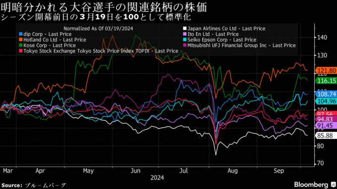 ブランドアンバサダーに大谷選手を2023年12月に起用した人材サービスのディップは、大リーグのシーズンが開幕した3月20日から10月3日まで株価が8.7%上昇した。23年からスキンケア商品の宣伝に大谷選手を起用しているコーセーは16%高だ。一方で4月末に大谷選手との契約を発表した伊藤園は広告費増に直面して8.6%下落、大谷選手とサポート契約を結ぶ日本航空(JAL)も14%安だ。