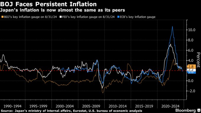 日本のインフレ率が目標を上回ったまま推移した場合、日銀が追加利上げまで待ち過ぎれば、2021年から22年序盤に生活費上昇への対応が遅れた米金融当局の二の舞になる恐れがある。8月の日本の全国消費者物価指数(生鮮食品を除くコアCPI)は前年同月比2.8%上昇となった。