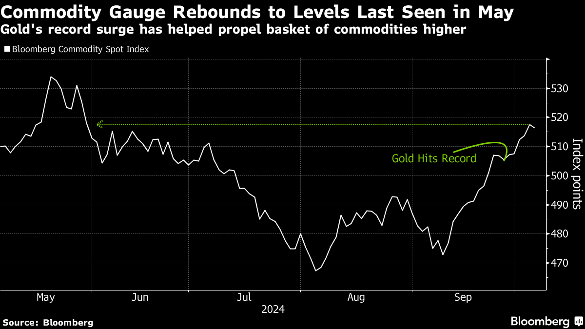 ブルームバーグ商品スポット指数は、過去最高値を何度も更新した金相場の上昇などに支えられ、5月後半の高値を回復した。同指数に占める金の比重は17%で、それ以外に農産品・エネルギー・金属市場の24種の先物が組み込まれている。9月末にかけての天然ガスと銅の反発も指数の回復に寄与した。原油先物も中東での戦闘の影響で10月初めにかけ値上がりした。