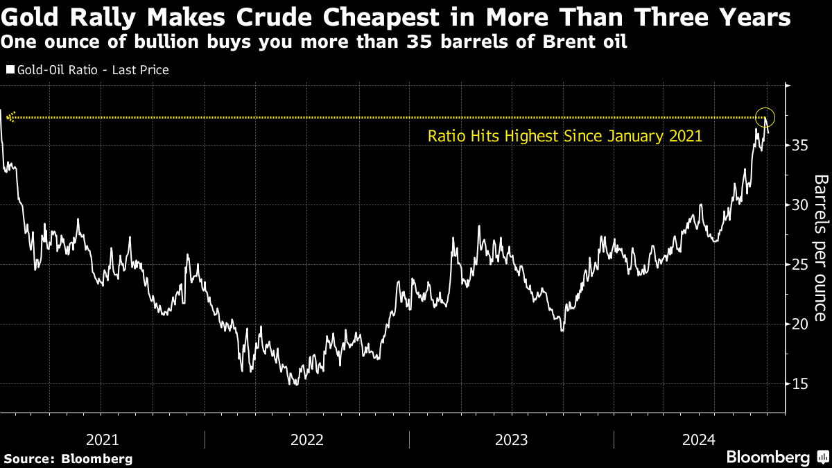 今年に入り金は急騰し、金価格との対比で原油は過去3年余りで最も安くなった。中東での衝突激化で勢いはやや鈍ったが、9月26日時点では、金1オンスで購入可能な北海ブレント原油の量は37バレル強と、2021年1月以降で最も多かった。