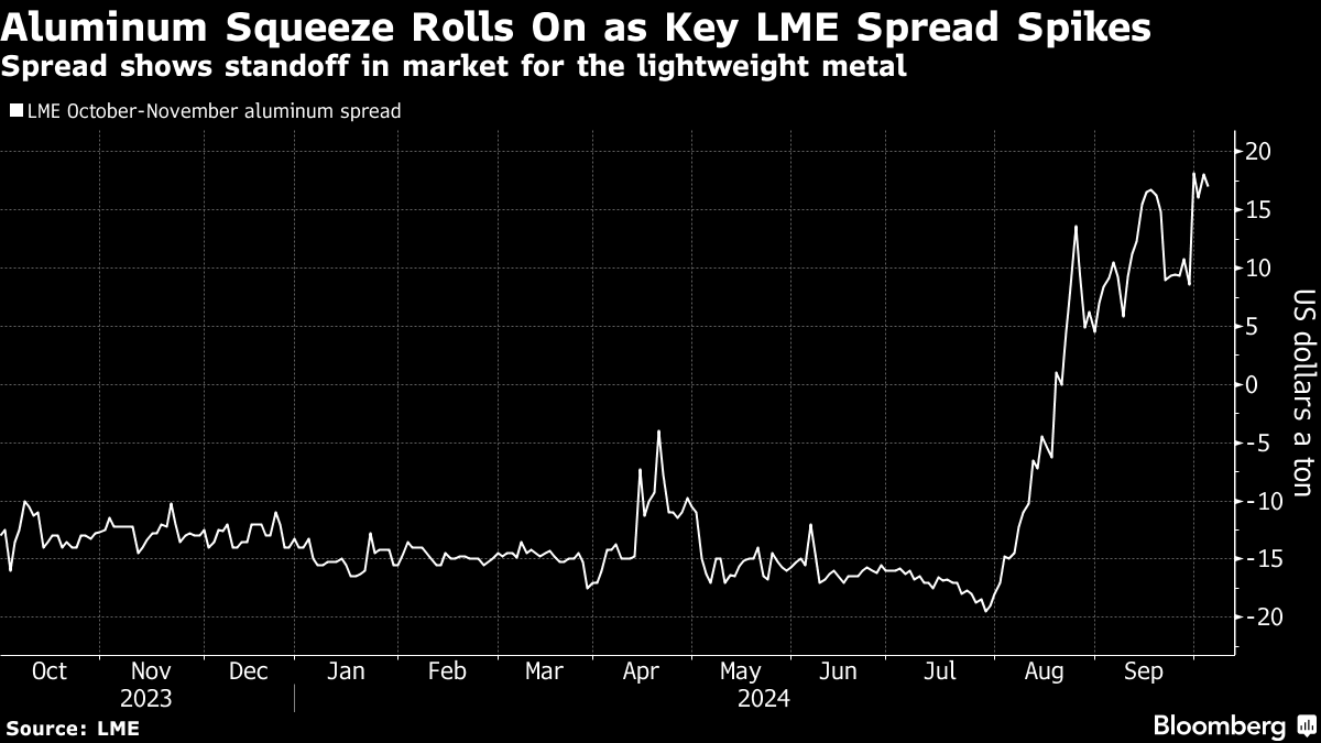 ロンドン金属取引所(LME)ではアルミニウム10月渡しの11月に対するプレミアムが拡大し、アルミ市場の需給が逼迫(ひっぱく)する兆候が見られる。LMEの指定倉庫会社イスティム・メタルズが管理手数料を引き上げて物議を醸す中で、LMEの倉庫からのアルミニウム引き出しで順番を待つトレーダーは、ヘッジポジションのロールオーバーが必要なため、圧力を受けている。