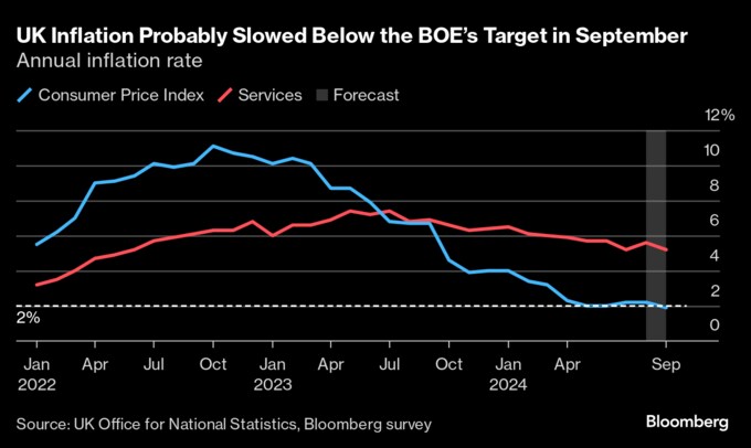 イングランド銀行のベイリー総裁は、緩和策をより積極的に行う可能性を示唆。9月の英インフレ率が21年4月以来初めて中銀目標の2%を下回る水準に低下したとエコノミストらはみている。