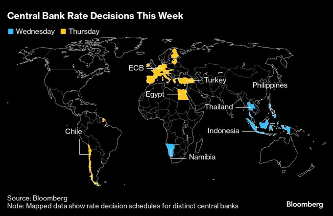 中国の経済統計では、目標を下回る経済状況が続いていることが示されるもよう。また、東南アジアからチリに至る中銀が金利決定を行う。英国のインフレ率はついに2%を下回る公算が大きい。