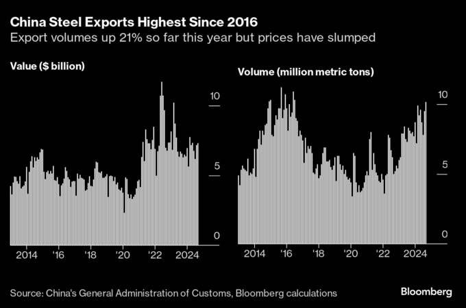 不動産市場の冷え込みで打撃を受けた中国鉄鋼業界は輸出に活路を見いだそうとし、9月の鋼材輸出は数量ベースで2016年半ば以来の高水準を付けた。