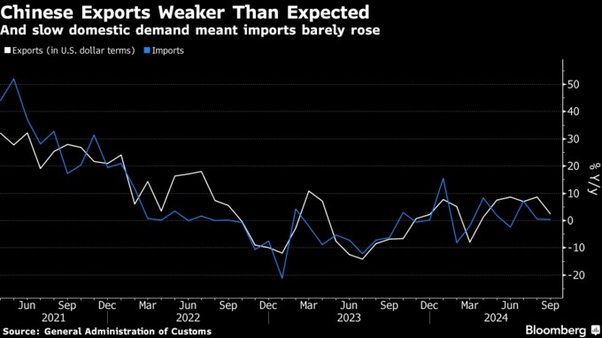 (ブルームバーグ):中国の9月の輸出は予想を大きく下回る伸びにとどまった。減速する中国経済にあって輸出の回復はこれまで明るい材料だったが、ブレーキがかかった。